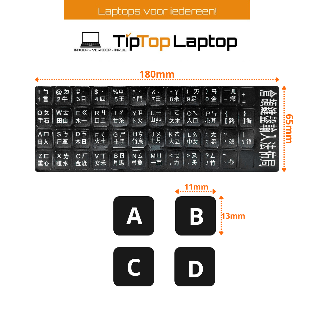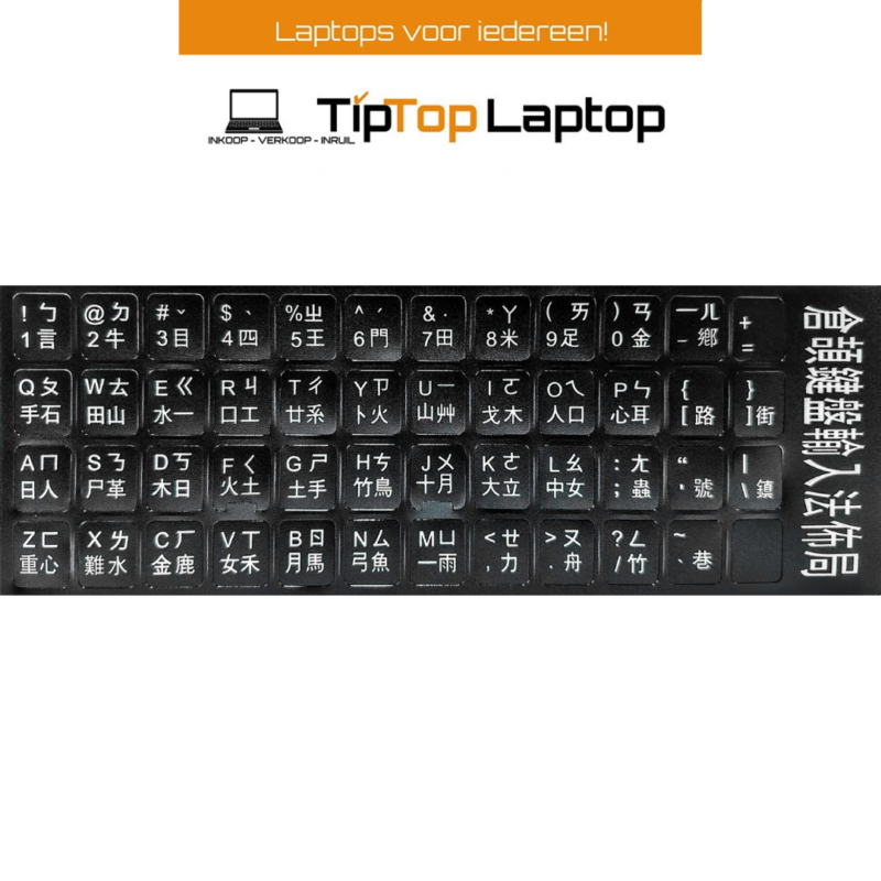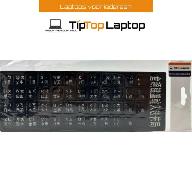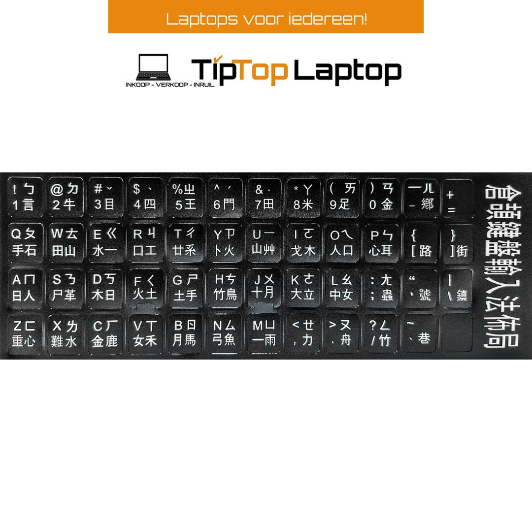 Dit stickervel bevat stickers voor een Chinese (QWERTY) toetsenbord, zodat je een standaard toetsenbord gemakkelijk kunt omzetten naar de Chinese indeling.